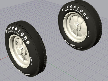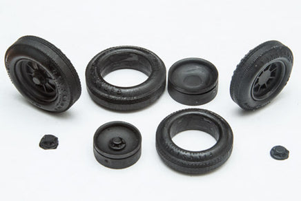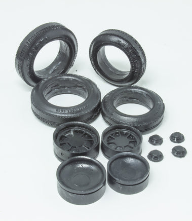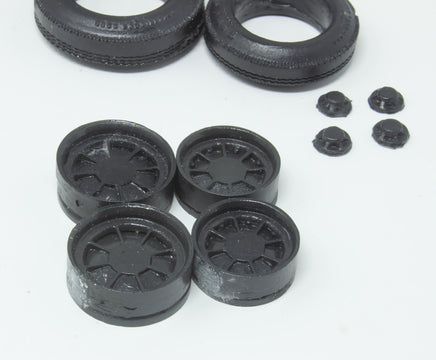 Accurate tires for the Monogram Kurtis Roadster Kit. Designed to true 1/24 scale dimensions. One set includes eight resin pieces; four tires, four wheels and four compression plates. Wheels are reversible to display either a spoked/convex side (pictured) or plain concave side as used on some cars of the era. Asymmetrical tire treads as was common. Front tire has two treads, rear tire has three. All tires have full raised lettering and decals are included that match the raised lettering. Tires can be displayed without painting, but for best results we recommend painting them with Dupli-Color Universal Flat black - available at Auto Parts stores. It has the perfect color and sheen of real tire rubber.