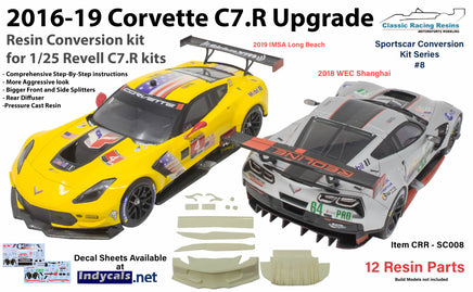This resin kit upgrades the 1/25 first-generation Corvette C7.R plastic kit into the more aggressive 2016-2019 Corvette C7R with a more aggressive nose, bigger front splitter, wider side splitters, full rear diffuser, wider rear wing, accurate rear wing supports, resin exhaust pipe separate camera pod for the roof for easier painting and decal application.
